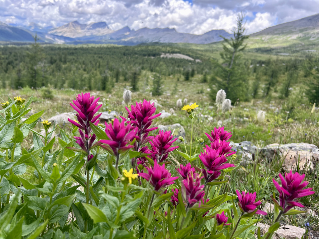 Th walking is mostly flat now along a series of massive mountains hugging closely above wildflower-strewn boggy meadows. Clouds build and we hear thunder in the distance, but it never rains. After 5,000 feet of climbing, we arrive at the turnoff that takes us out of Kootenay Park and onto public land where random camping is allowed.