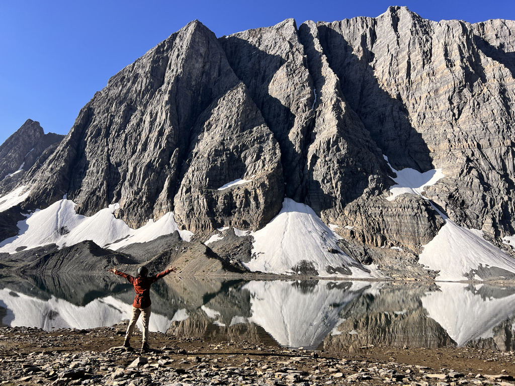 It’s a stunning walk through a long meadow with Assiniboine and its snowplow-like glaciers receding behind us, still in view with no clouds. Our final water before the five-mile push to our site is at Og Lake. And there’s Doug on the last day of his section hike.