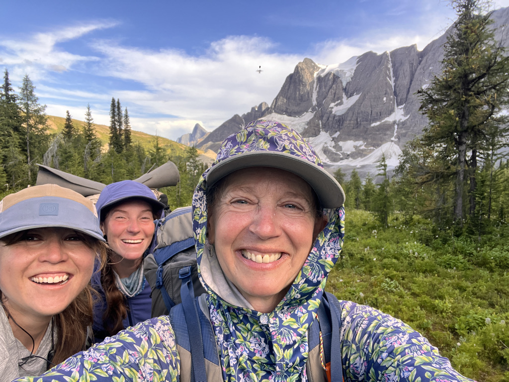 It’s a short walk out today on a forest road which Katlyn aptly names the “People Mover.” Our breakfast is at the picnic table with a view to Goodsir Mountain and a chalky blue creek bending in a C directly below us.
